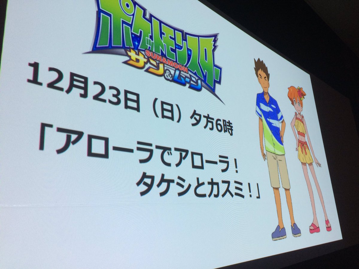 Durante el «Wongoo Fes» celebrado en Tsukuba (Japón) se ha revelado un nuevo título de episodio para la serie Sol y Luna, concretamente el número 102 que se emitirá el 23 de diciembre, anunciando que Brock y Misty viajarán a la región de Alola para reunirse con Ash tras la invitación de este último en S&L043. El título del mismo es ¡Un Alola, en Alola! ¡Brock y Misty! en una clara referencia al S&L042: ¡Un Alola en Kanto! ¡Brock y Misty! Más detalles, próximamente…