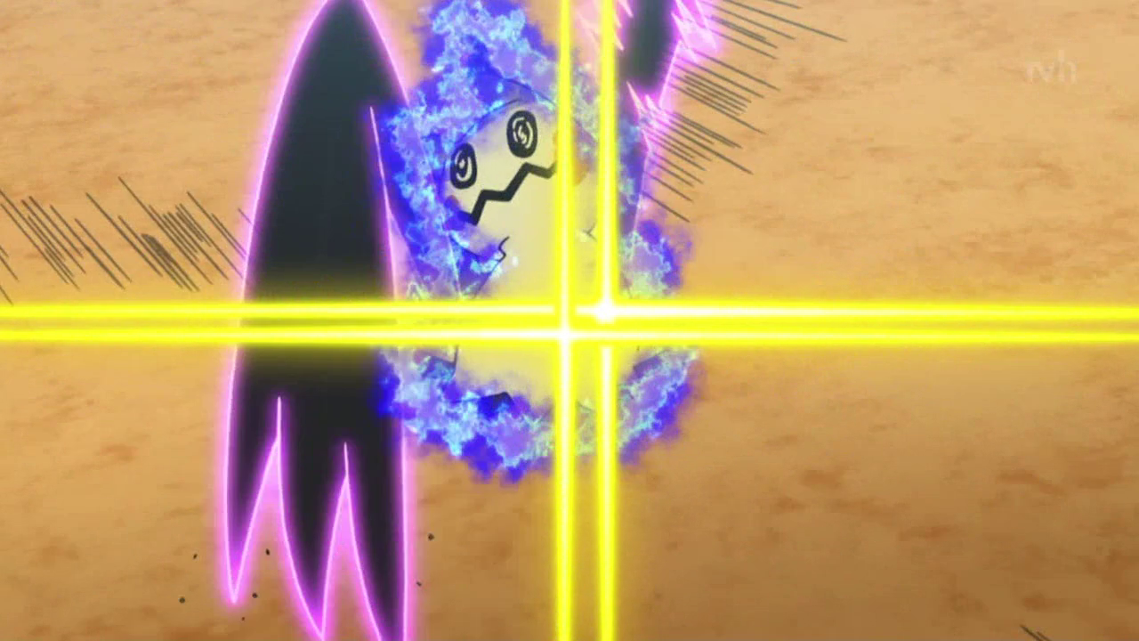 Quien a su vez cae ante la Bola Sombra de Mimikyu, el «mata Pikachus». El plan del Team Rocket era evitar combatir, pero Mimikyu tiene sed de venganza contra Pikachu.