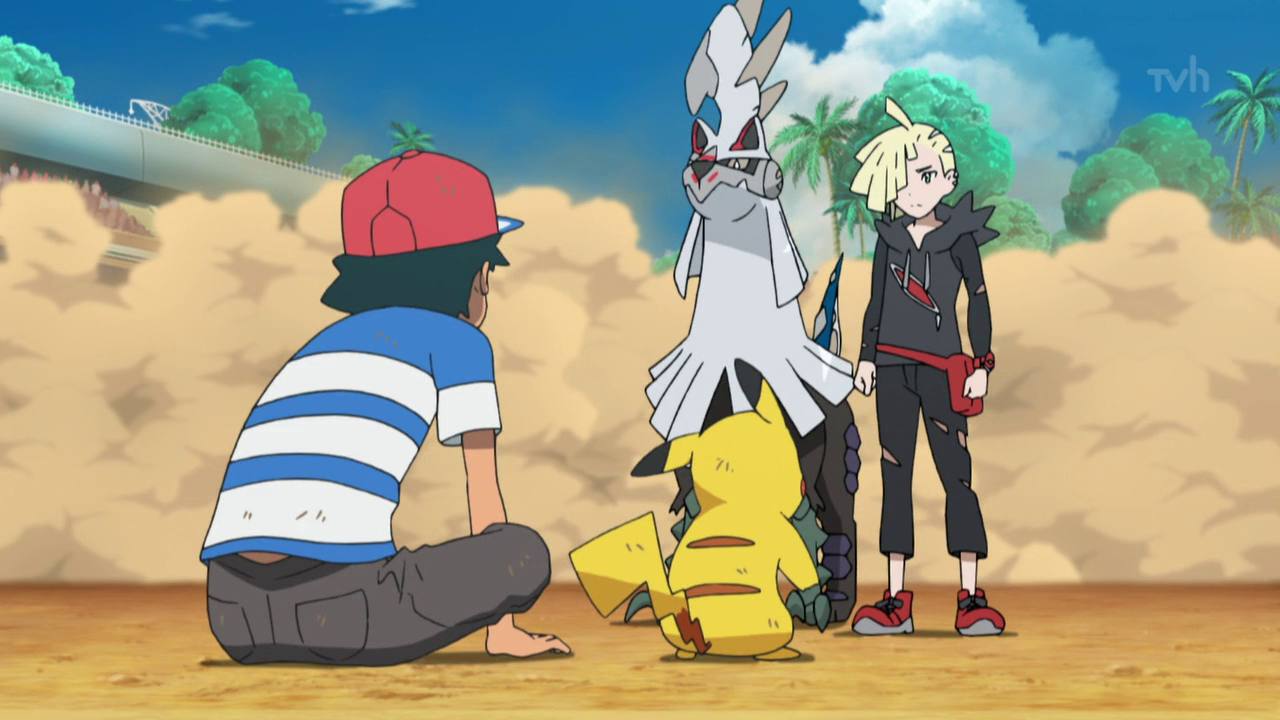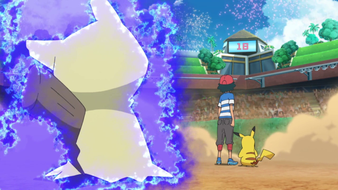 El Pikachu de Ash usa Rayo para derrotar a Skarmory GyaradosKiawe Turtonator se defienden de un Sandslash Alola.