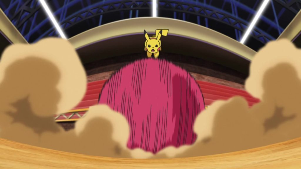 Ash le ordena a Pikachu girar a la inversa sobre él, una vez lo suelta Electrode no tiene control sobre sí mismo y acaba chocando contra la pared.