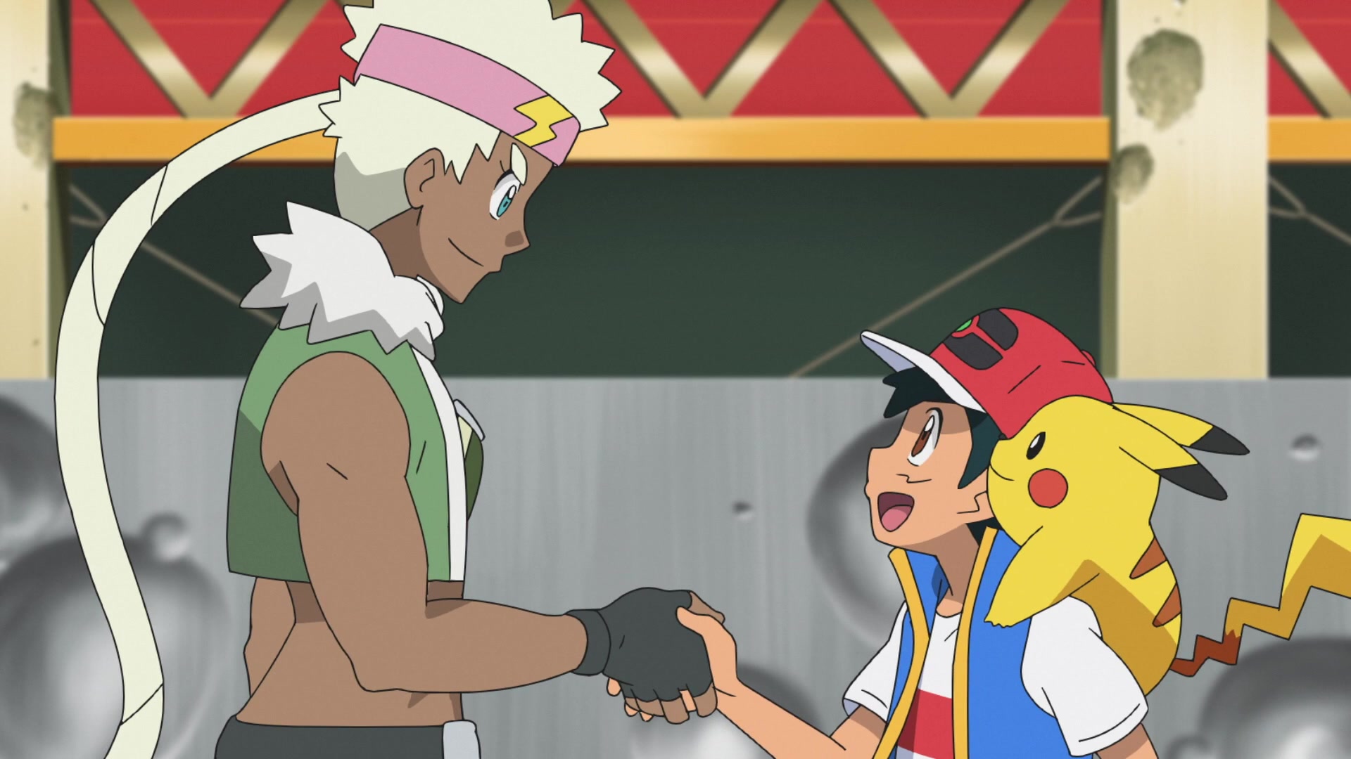 Ash y Pisces realizan un fuerte apretón de manos. Pisces dice que avisará al Teniente Surge, creo que querrá luchar con este tú más fuerte que aquella vez.